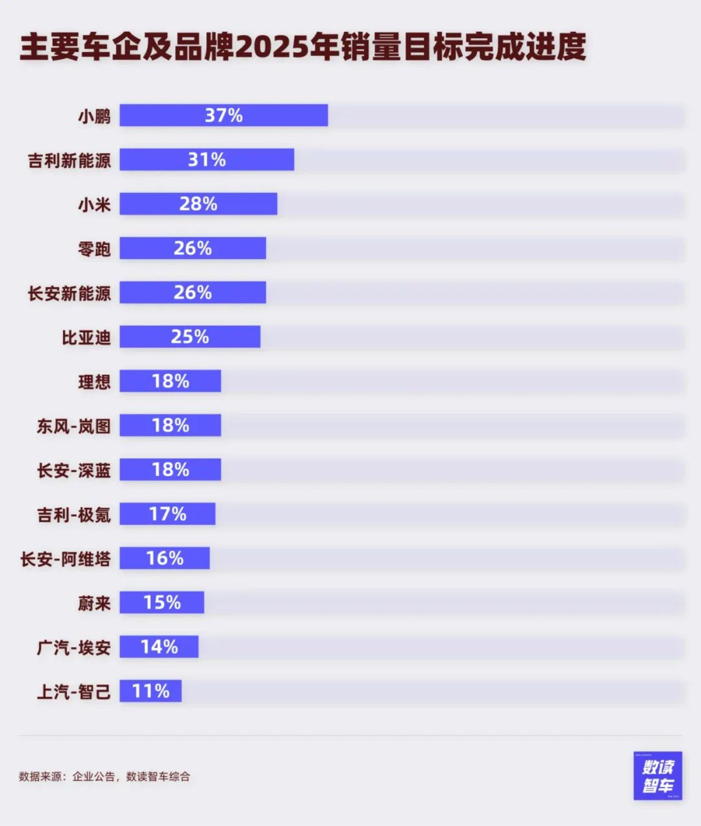 2025过去了三分之一,有不少车企的指标完成度很高。小鹏已经完成年度销量的37%,吉利完成31%,实现全年的目标并不困难。